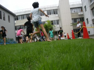 芝生化された公園で子供たちが遊んでいる姿を見て