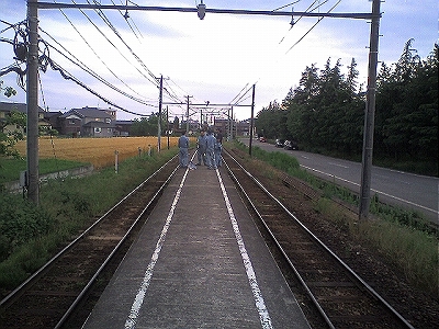技術くんたち、こんなところで打ち合わせをしています。これって、そう、ホームです。電車男のk井さんに聞いたところ、”えちぜん鉄道”っていう路線なんだって。こんなにコンパクトなホーム、珍しいですよね。。