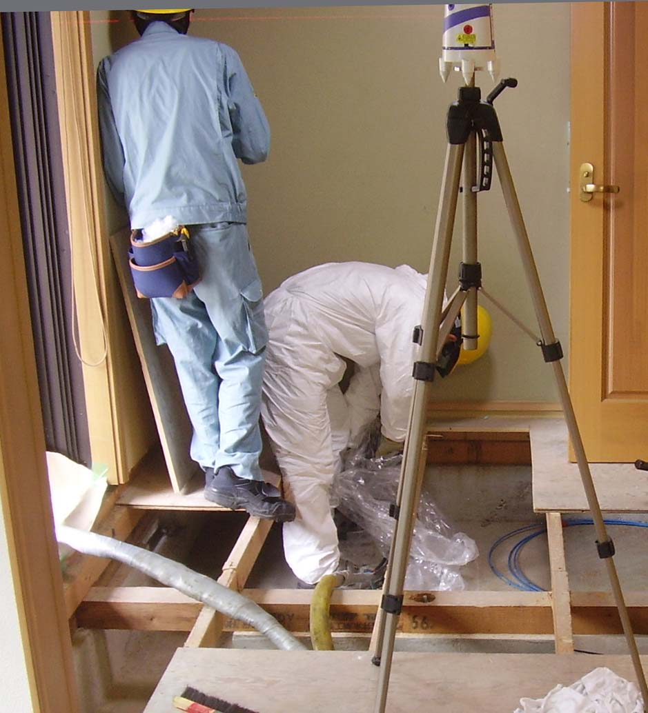 住宅の場合、床下に人が潜れる高さがあれば、台所の床下収納庫などから床下に潜って作業させて頂く場合が多いのですが、この現場は、その”高さ”が十分でなかったので、床を剥がして作業させて頂きました。