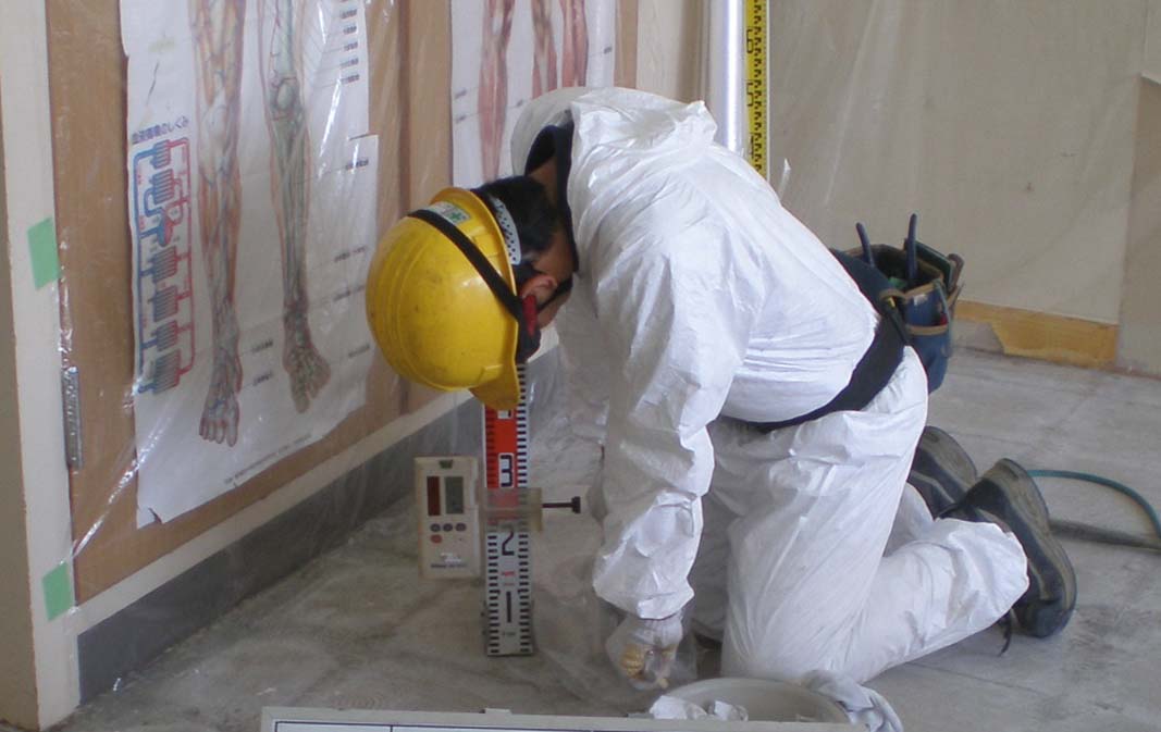 最大沈下63ミリ。校長室と保健室の床沈下修正工事と、床下空隙充填工事(平均空隙90mm)をさせて頂きました。
