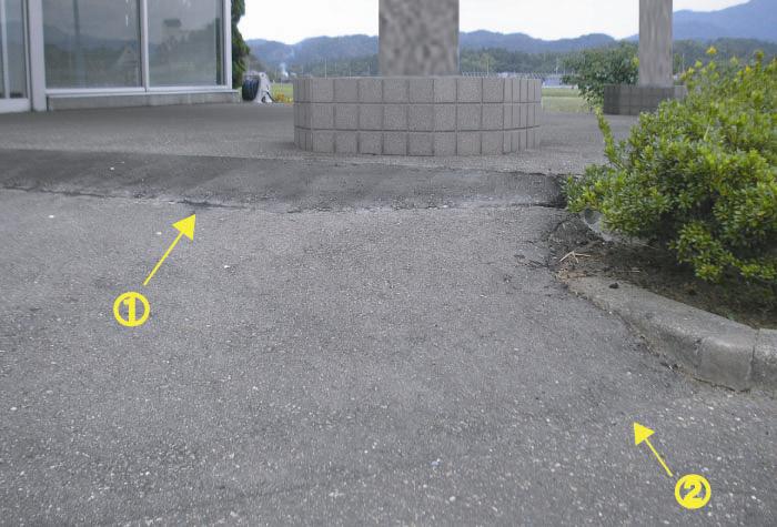 ①の部分が、約2年ほど前に発生した新潟中越地震の影響で下がった場所、②の部分が、今夏発生した新潟中越沖地震の影響で下がった場所だそうです。