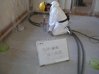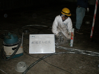 ここは関東圏内にある倉庫です。軟弱地盤が原因で床が下がったところを、アップコンの沈下修正の技術で施工させて頂きました。