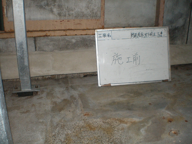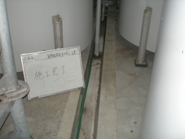 施工前(左写真)・・: 地震の影響で床が沈下し傾いた影響で、貯蔵タンクの間にある水路の片方に水が溜まった状態でした。