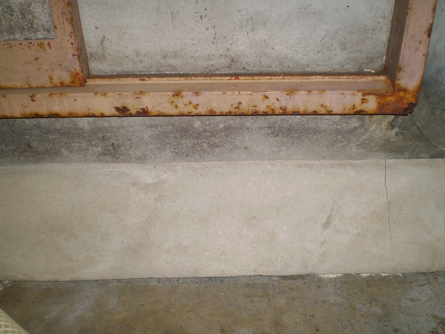 施工前(左写真)・・: 倉庫壁の下部にあった隙間。
