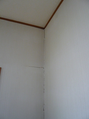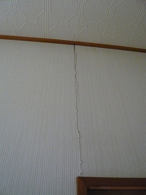 家内には、家の傾きが原因で、あちこちの壁紙に↑亀裂↑も確認できました。