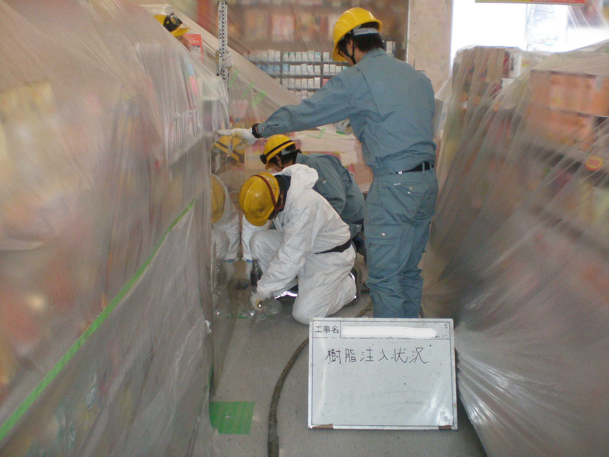 軟弱地盤が原因で、最大68ミリ沈下していた店舗の床を、1日で施工させて頂きました。(施工面積:約100㎡)