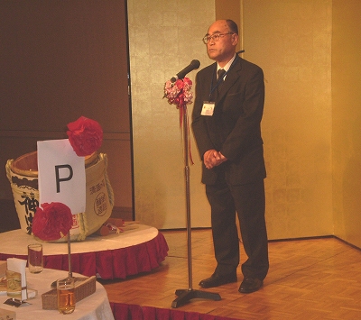 鏡割りの後、アップコンくんの焼印が押された5周年記念の枡にお酒が配られ、乾杯の音頭は、y岡部長。