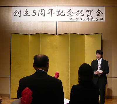 「僭越ながら、乾杯の音頭を取らさせて頂きます。私どもは、少々突っ走ってきたところがあり、まだまだ足りないところは山ほどあります。今日この会場にお越し頂いておりますお客様に、もう少し甘えさせて頂き、皆様のお力をお借りしたいと思っています。社員一丸となって頑張っていきたいと思っております。アップコンの輝かしい未来を祝しまして”