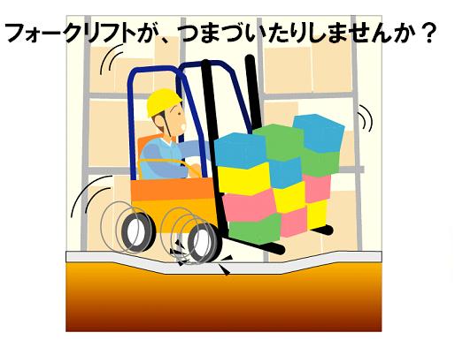 「倉庫の床が地盤沈下が原因で一部沈下し、その影響で床に段差が生じラックが傾いている。その床をアップコンの特殊ウレタン樹脂で、営業を止めずに超短時間で修正。」