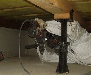 アップコンの住宅不同沈下修正工事は、床下に人が潜れる高さがあれば、今回の現場のように床下で作業させて頂きます。
