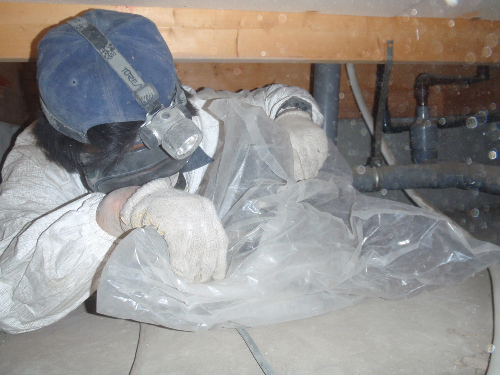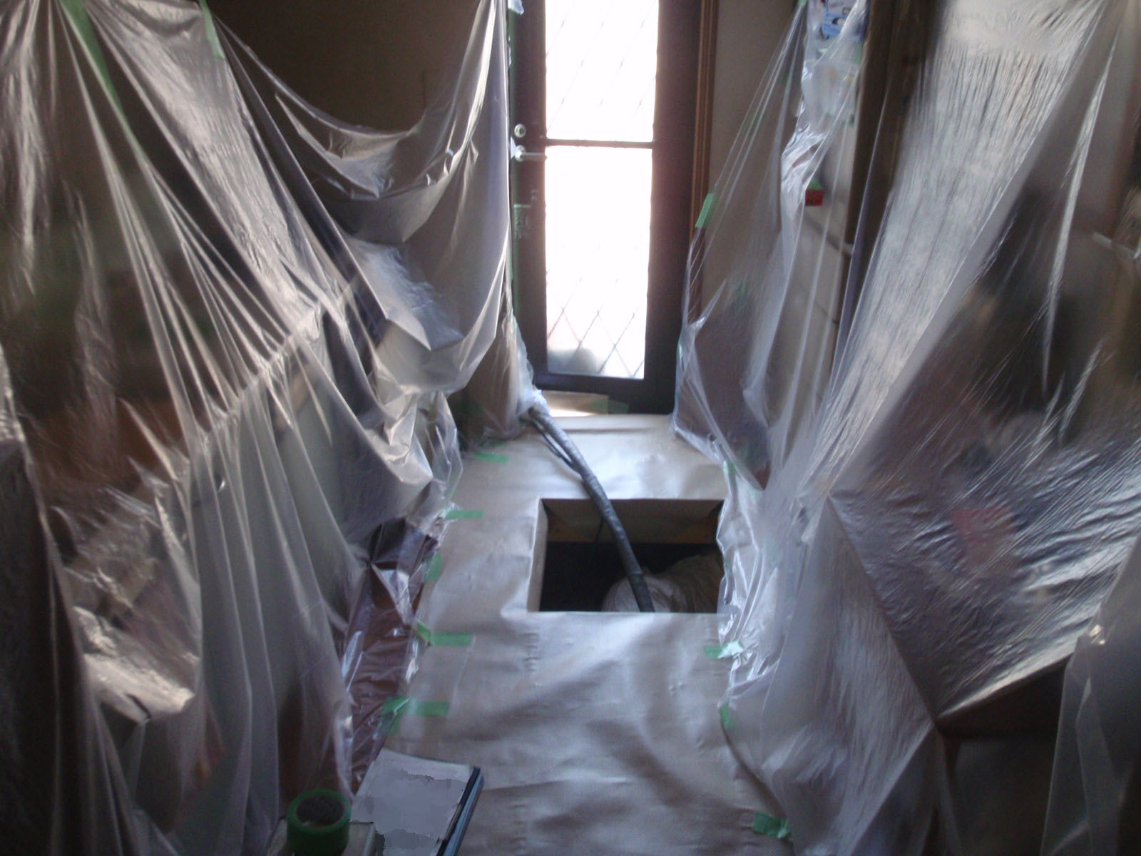 しっかりとビニールで養生させて頂きました台所の床下収納庫から、床下に入らせて頂き、作業させて頂きました。