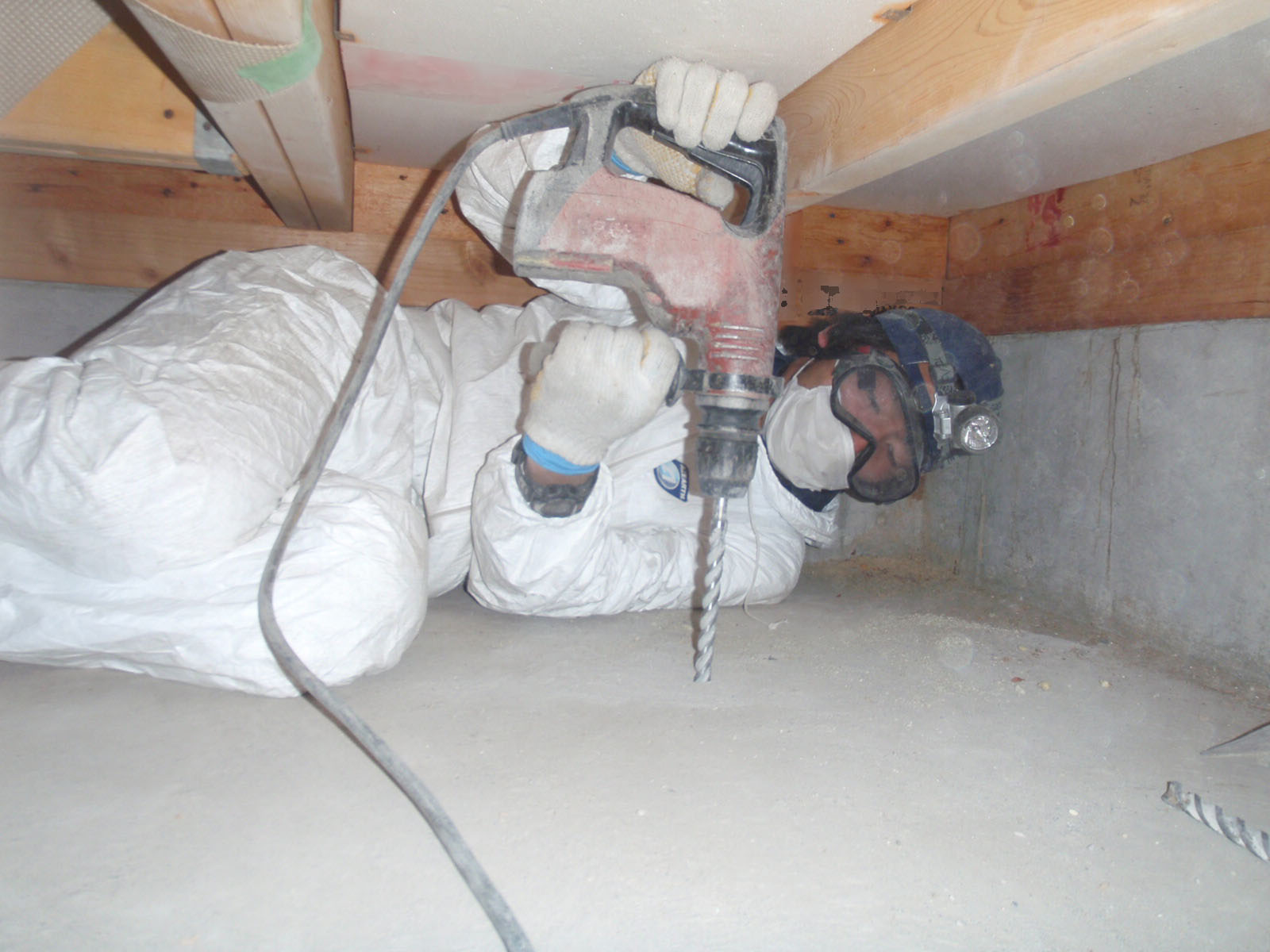 不同沈下で傾いた住宅の基礎下に特殊ウレタン樹脂を注入し、樹脂の発泡圧力で沈んだ住宅を元に戻す工法です。お客様に普段通り生活して頂きながら、超短時間で修正します。
