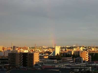 。アップコンの1日が終わるころ、事務所の窓の外を見ると、雨がやみ、夕日と虹が出ていました。