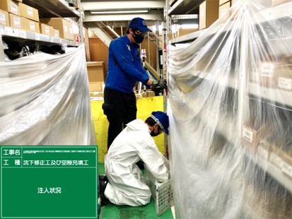 北海道にある自動車メーカー様の事務所、部品庫の沈下修正工事の施工事例です。 沈下により建物が傾き扉の開閉に支障をきたしたり、天井に隙間ができていました。 操業を止めず、短工期で施工できることからアップコン工法をご採用いただきました。