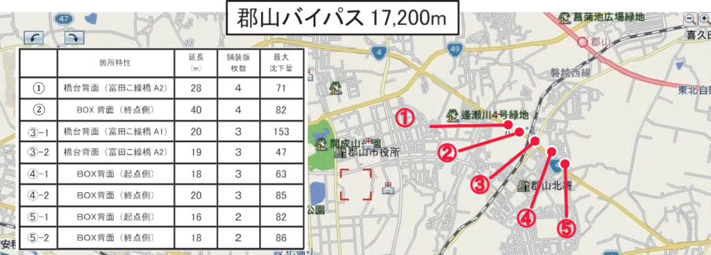 全長17,200mの道路区間内、計8か所で沈下修正・段差修正を実施しました。 総施工面積約2430㎡、実働日数24日に及ぶ大規模工事でしたが 全ての地点で計画値までの修正が完了しました。 ▼修正地点▼施工完了後(③-1)