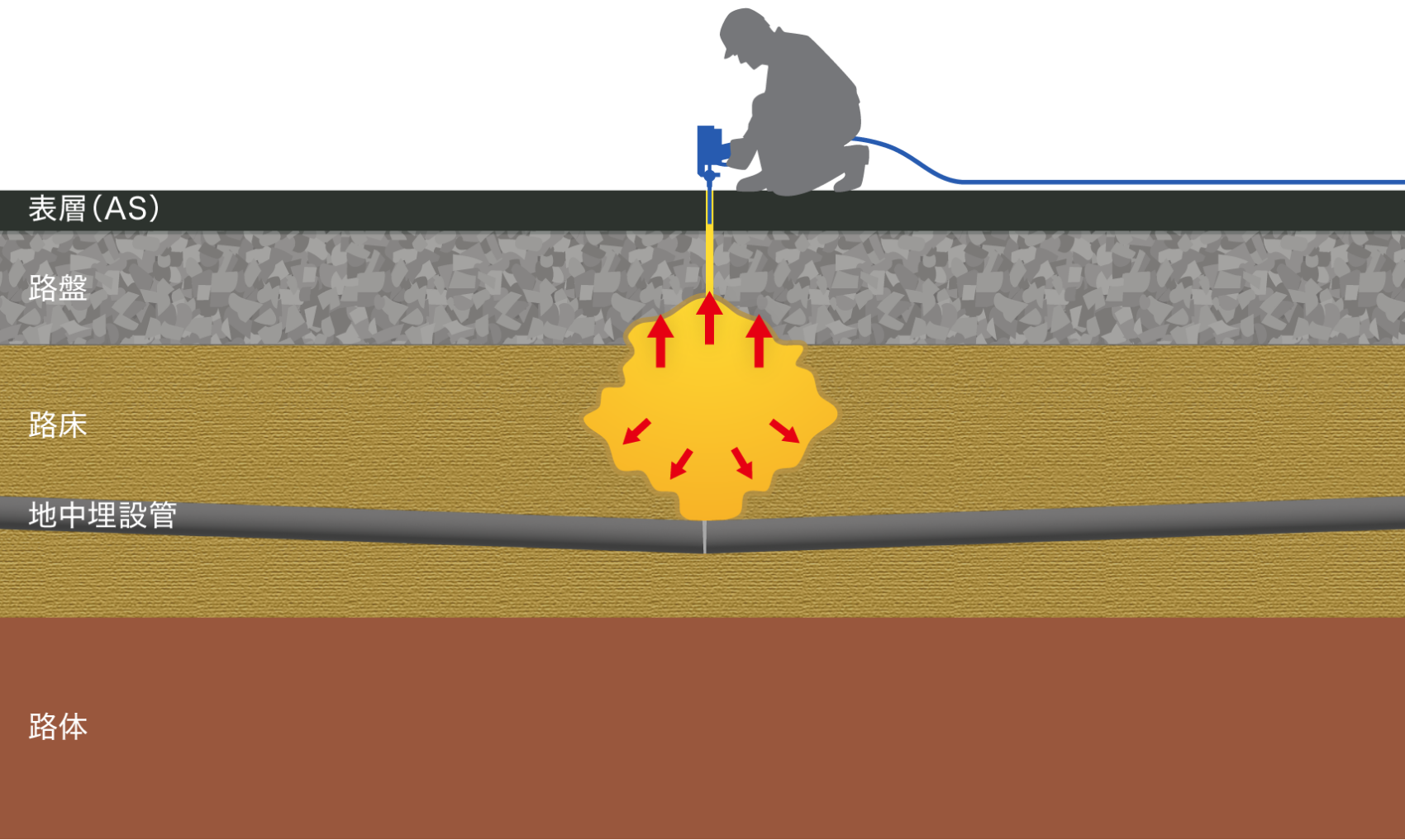 路盤下の空洞に特殊ウレタン樹脂を注入し、発泡・膨張圧力で素早く空洞を充填します。